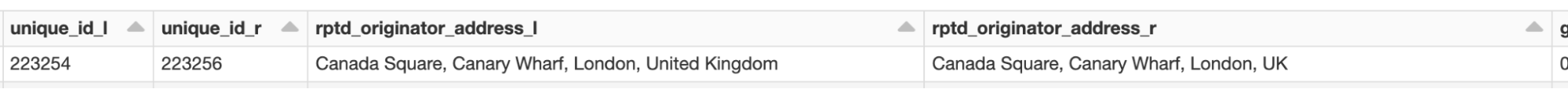 上でお伝えした通り、NY Melon銀行のアドレスにおいて、“Canada Square, Canary Wharf, London, UK”と類似した“Canada Square, Canary Wharf, London, United Kingdom”という幾つかの一貫性の欠如を迅速に発見しました。AMLの調査に使えるように、重複を排除したレコードをDeltaテーブルに書き戻すことができます。