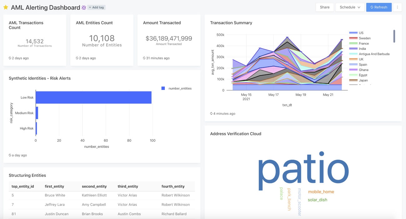 添付のノートブックはトランザクションオブジェクト、エンティティオブジェクトを生成し、可能性のあるストラクチャリング、偽造ID、事前学習済みモデルを用いた住所の分類に関するサマリーを作成します。以下に示すDatabricks SQLのビジュアライゼーションにおいては、これらに対する要約処理を実行するためにPhoton SQLエンジンと、数分でレポート用ダッシュボードを作成するためのビルトインのビジュアライゼーションを使用しました。テーブル、ダッシュボードに対する完全なACLを適用できるので、ユーザーはこれらを経営陣やデータチームと共有することができます。定期的なレポートの実行のためのスケジューラもビルトインされています。このダッシュボードは、AMLソリューションに組み込まれたAI、BI、分析エンジニアリングの集大成と言えます。