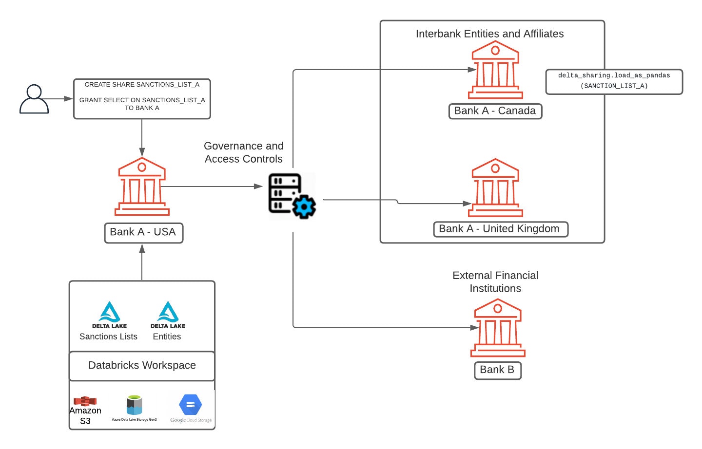 情報共有の促進は透明性を改善し、米国の金融システムをマネーロンダリングや金融テロリズムから防御しますが、情報交換は適切なデータセキュリティ保護を用いたプロトコルを使用すべきです。情報共有のセキュリティ保護の問題を解決するために、Databricksはデータ共有のためのオープンかつセキュアなプロトコルであるDelta Sharingを最近発表しました。PandasやSparkのような慣れ親しんだオープンソースのAPIを用いて、データの提供者と消費者はセキュアかつオープンなプロトコルを用いてデータを共有することができ、FinCEN規制への準拠できるように、全てのデータトランザクションに対する完全な監査を維持することができます。