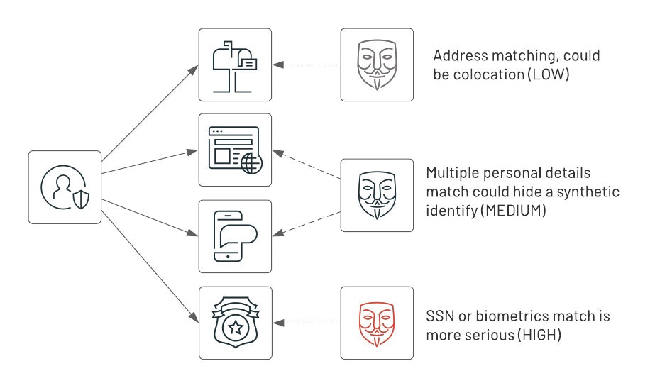 上で述べたように、偽造IDの存在はアラームの原因となりえます。グラフ分析を活用することで、リスクレベルを検知するためにトランザクションの全てのエンティティをバルクで分析します。