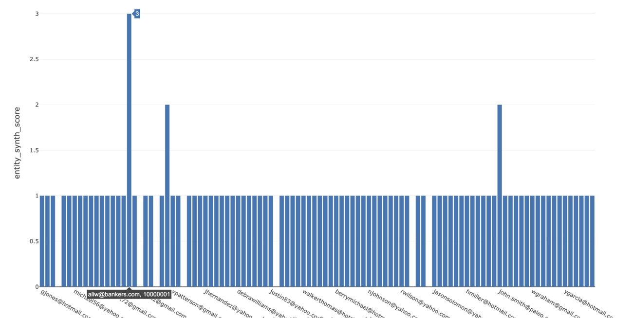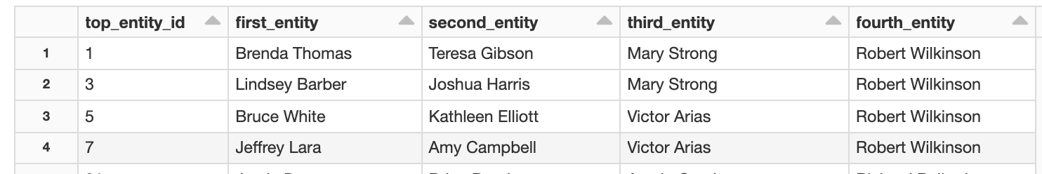 次に、個人IDとスコアがオーバーラップする2つのエンティティを特定するためのクエリーを実行します。グラフコンポーネントをクエリーした結果に基づき、1つの属性(住所など)のみが一致する個人から構成される集団を期待する場合もありますが、これはさほど大きな問題ではありません。しかし、より多くの属性が一致した場合には、アラートを出すことを考えるべきです。以下に示すように、SQLアナリストは全てのエンティティに対するグラフ分析の結果を日次で得ることができ、3つの属性全てが一致したケースでアラートを出すことができます。
