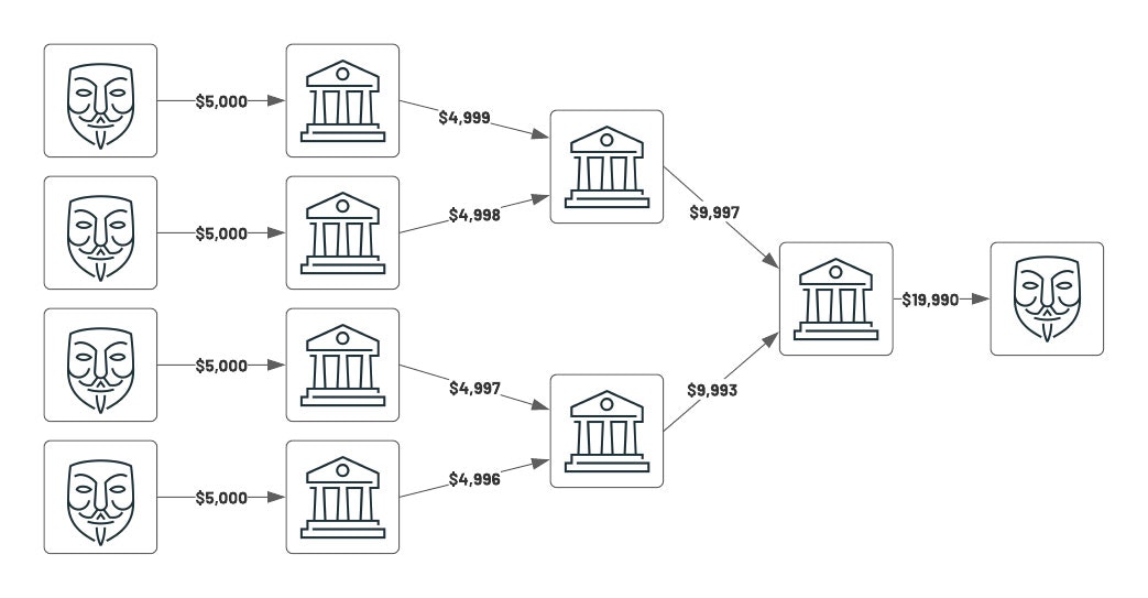別の一般的なパターンはストラクチャリングと呼ばれるものです。これは、複数のエンティティが共謀し、一連の銀行に対して小規模の「レーダーをかいくぐる」支払いを送信し、最終的な機関(以下の図における一番右)に大量の金額を集めるというものです。このシナリオにおいては、全ての登場人物は$10,000ドルの閾値以下に留まっていますが、多くの場合アラートを出すべきです。グラフ分析で容易に対応できるだけでなく、別のネットワークの組み合わせを拡張し、同様の方法で疑わしいトランザクションを特定するために、モチーフ探索技術を自動化することもできます。