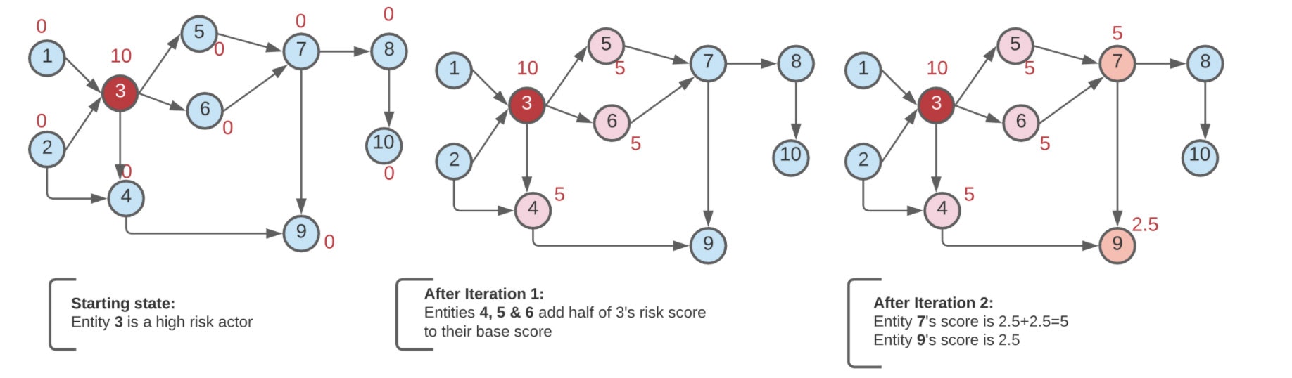 上の図はネットワークの初期状態とその後の2つのイテレーションを示しています。リスクスコア10を持つ1人の悪者(#3ノード)がいる状態からスタートするとします。このノードとのトランザクションがある全ての人々(この場合、ノード4、5、6)に対して、例えば、悪者のリスクスコアの半分を引き渡し、彼らのベーススコアに追加することでペナルティを与えたいとします。次のイテレーションでは、ノード4、5、6から下流の全てのノードのスコアも調整されます。