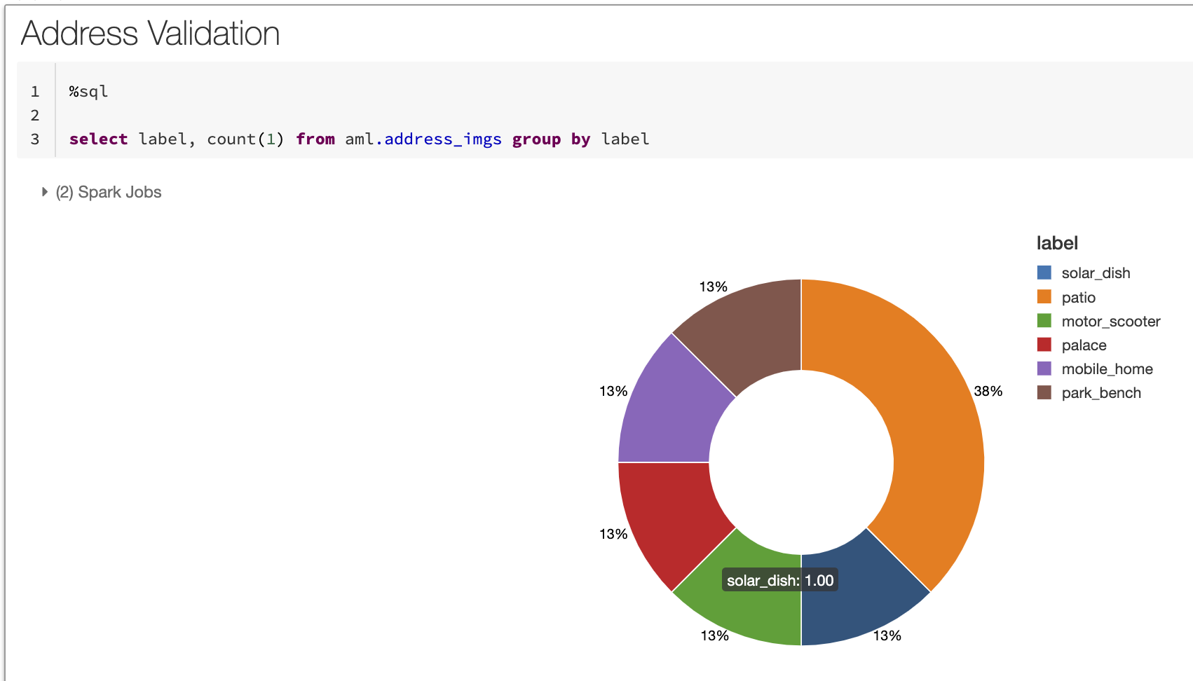 簡単に触れたいパターンとしては、テキストの住所と実際のストリートビューの画像のマッチングがあります。多くの場合、AMLアナリストは、ファイル上のエンティティにリンクされている住所の正統性を検証する必要があります。この住所は商業ビルあるいは居住エリア、それともシンプルな郵便箱なのでしょうか?しかし、写真の分析は多くの場合、面倒かつ時間を浪費し、写真の取得、クレンジング、検証はマニュアルの作業となります。レイクハウスのデータアーキテクチャでは、PyTorchと事前学習済みオープンソースモデルとPython、MLランライムを用いることで、これらのタスクの大部分を自動化することができます。以下は、人間の目で見て適切と見做せる住所の例となります。検証を自動化するために、住居を検知するために使用できる、適切な数百のオブジェクトに対して事前トレーニング済みのVGGモデルを使用します。