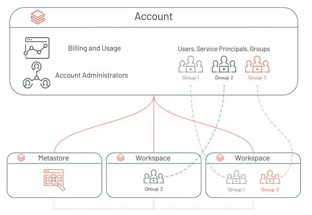 ワークスペースレベルで作成されたユーザーとサービスプリンシパルは自動でアカウントに同期されますが、ワークスペースで作成されたグループは同期されません。代わりに、Databricksには、特殊な挙動を持つアカウントグループとワークスペースローカルグループというコンセプトがあります。