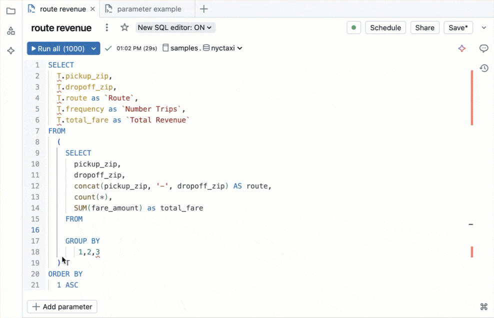SQLエディタでNew SQL editorのトグルをオンにします。
