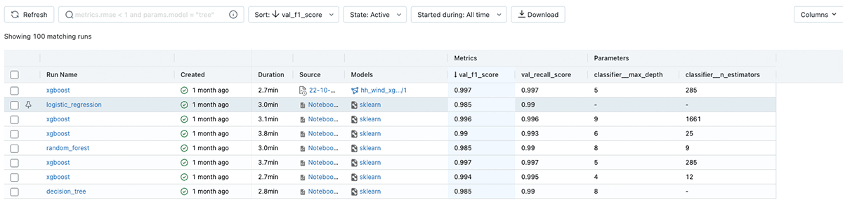 runs = mlflow.search_runs(filter_string=f'tags.mlflow.parentRunId = {parentRunId}', order_by=[f'metrics.{metric} ASC'])