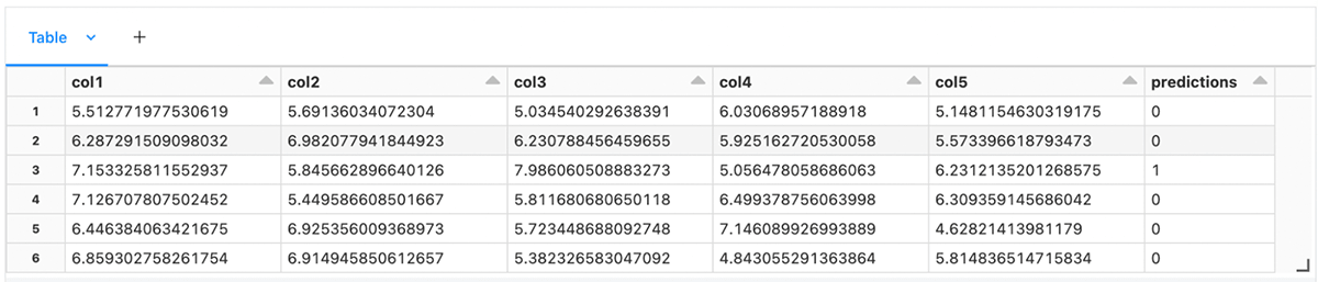 最後に、結果の(SparkかPandas)データフレームを表示し、まさに今生成した異常予測を観察します。