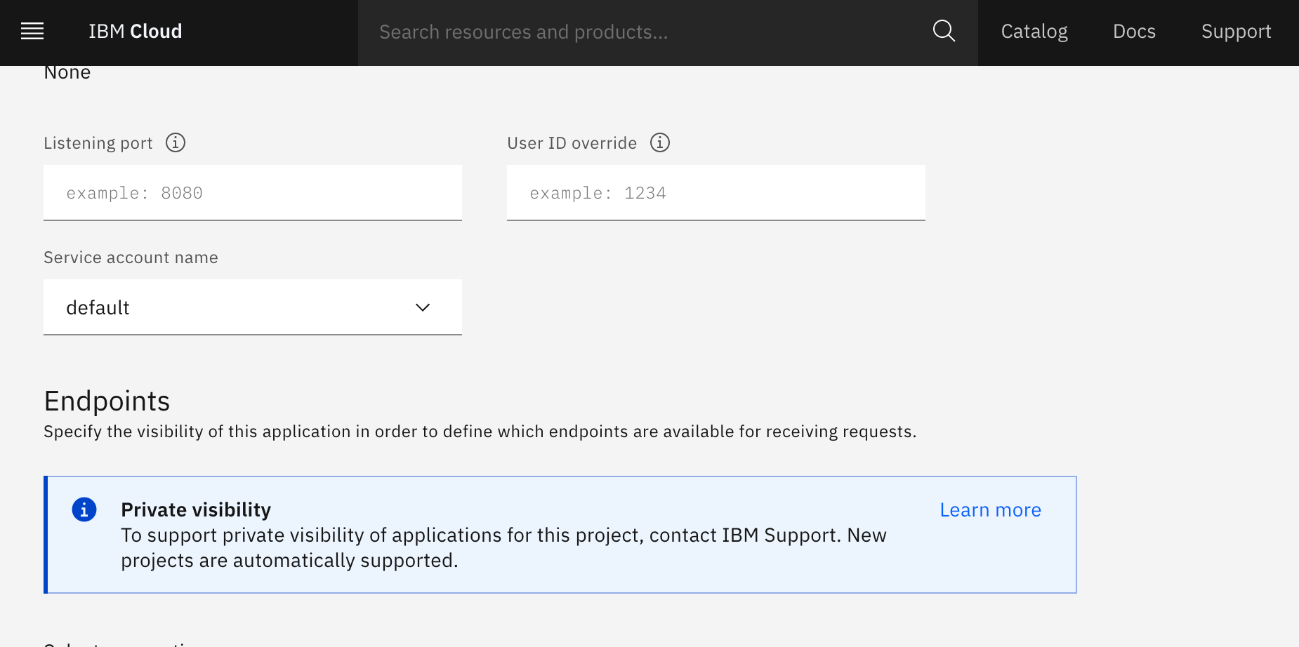 $ ibmcloud ce application create -n myapp-hello --image icr.io/codeengine/helloworld --visibility=private
