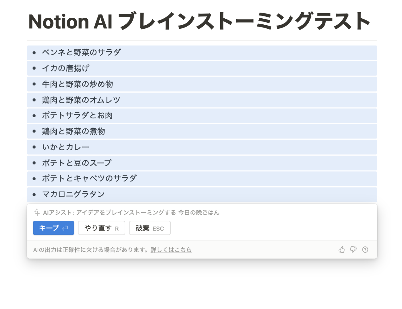 試しに、Notion AIに今日の晩ごはんを聞いてみました。