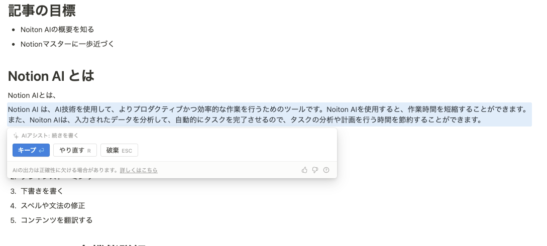私が記述したのは「Notion AIとは」までで、それ以降はご本人です。