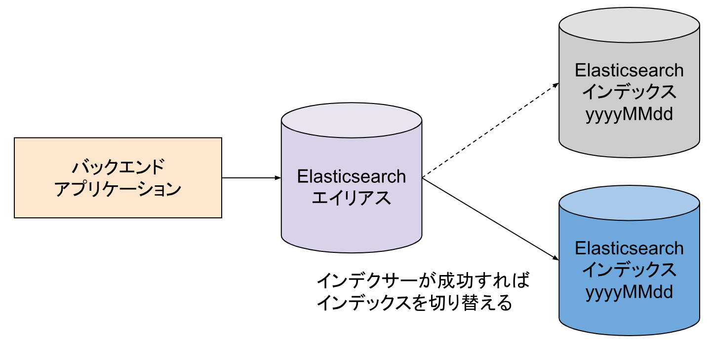 Elasticsearch はデータ更新中に RDB のようにトランザクションがありません。そのため、インデックスを切り替えることで、データの整合性を保ちながら更新を行います。
