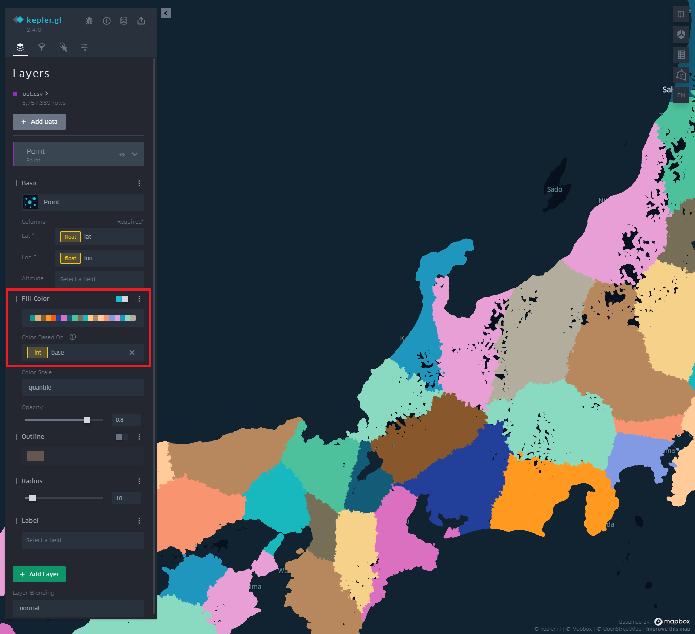 kepler.glのレイヤー設定より、表示する色をbaseによって分けるよう設定すると、各県庁毎に塗分けられます。