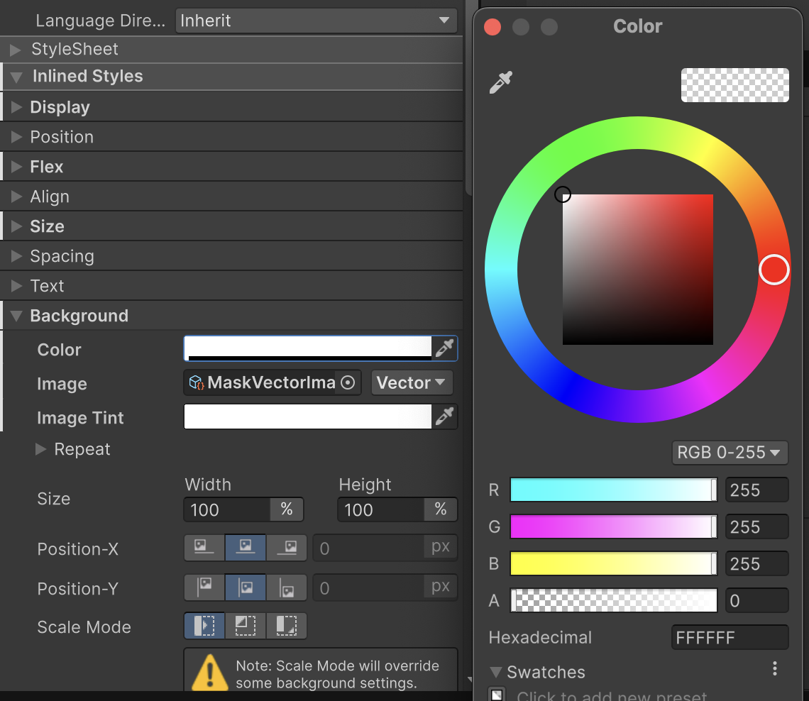 先ほど生成したVectorImageをセットし、BackgroundのColorのAlphaを0にします