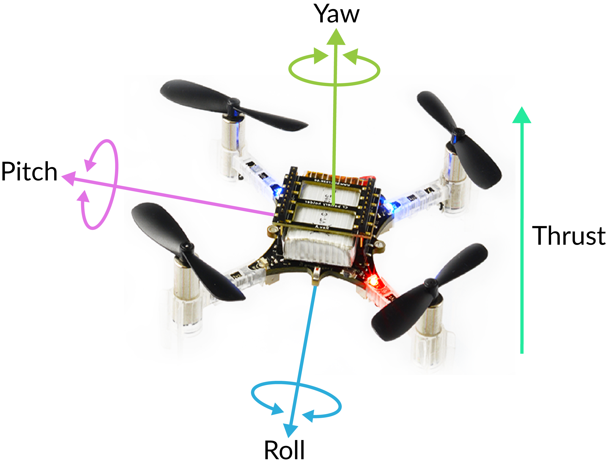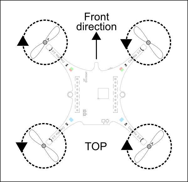 - Pitch: crazyflieを左から右に貫く水平軸を中心とした回転です。crazyflieを前後に動かすために使用します。