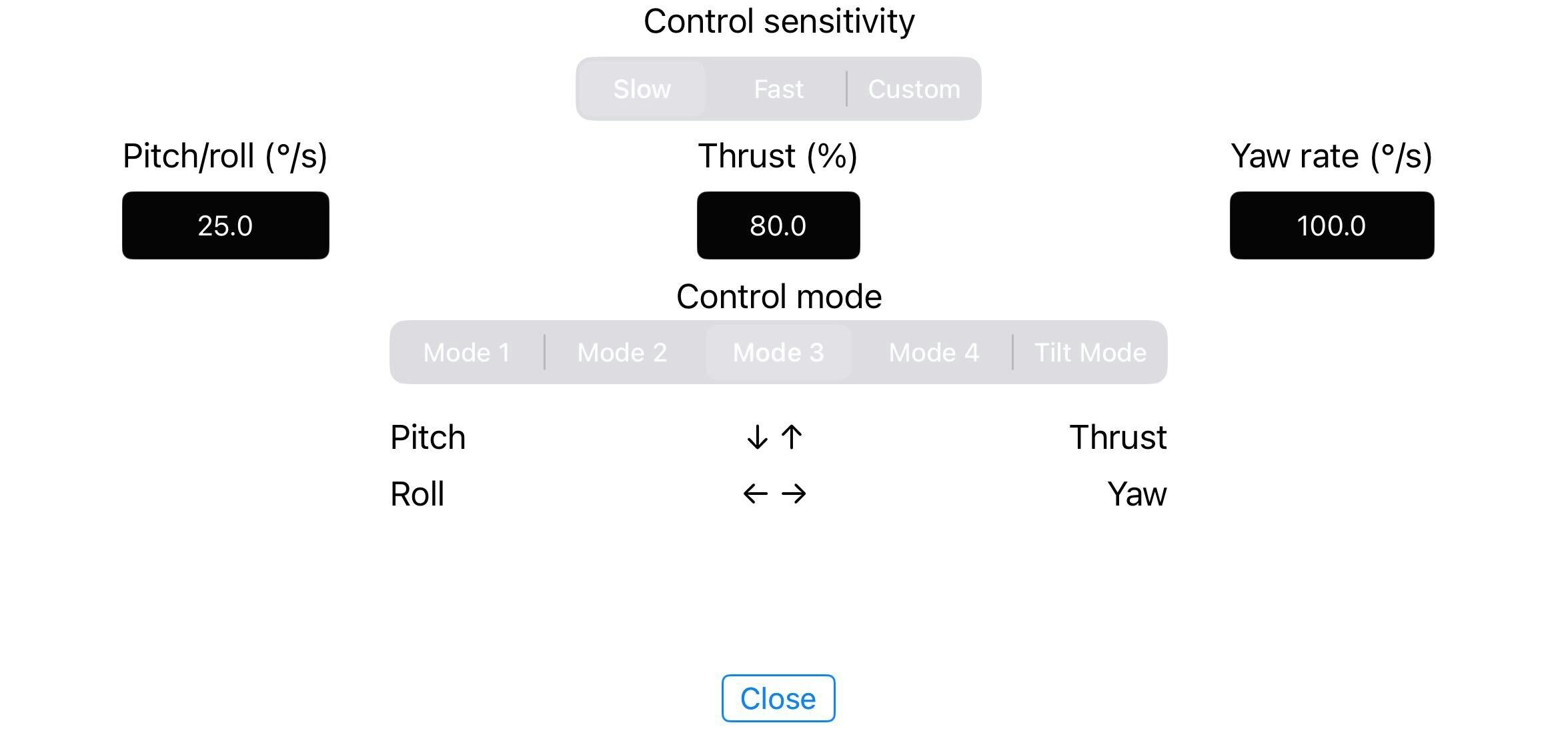 設定ではどの指でどのパラメタを操作するかや4つのパラメタの最大出力を設定できます。どの操作方法がやりやすいかは個人差があると思いますが、rollとpitchを同じ指で操作するmode2かmode3がやりやすいと思います。最初は低めの感度に設定するのがおすすめですが、Thrustを下げすぎると離陸できなくなります。