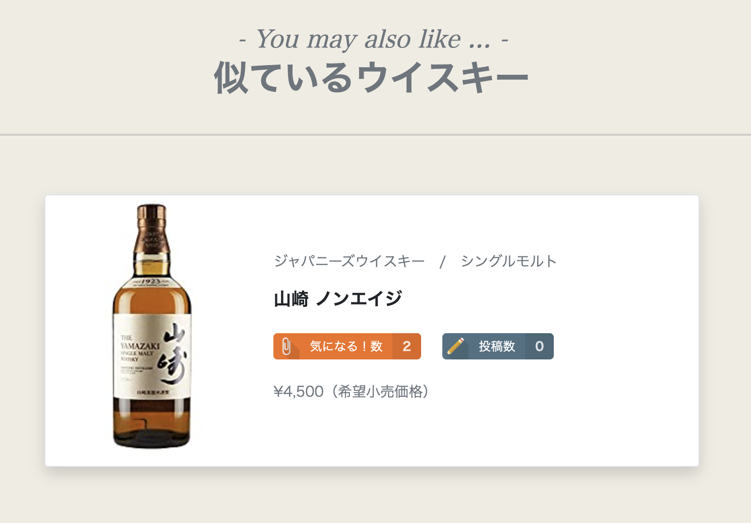 また、各ウイスキーに紐付けた「おすすめの飲み方」「フレーバー」から、独自メソッドを通して類似度の高いウイスキーを『似ているウイスキー』として表示することで、好みのウイスキーに傾向の近いものを探せます。