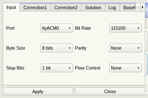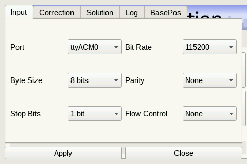 - RTKの場合は,Correctionタブで補正データのストリームを設定.さらに,基準局のBasePosタブで基準局の座標を入力.