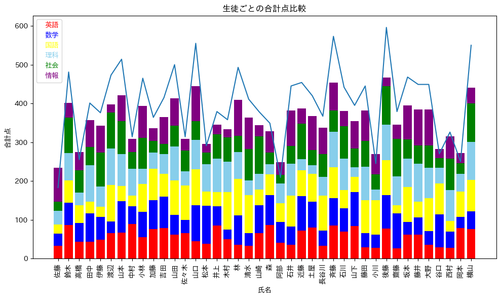 # 生徒ごとの合計点、平均点、偏差値を表示してください。また、生徒ごとの合計点の比較をするグラフを作成してください。