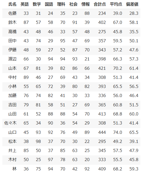 df['偏差値'] = ((df['合計点'] - df['合計点'].mean()) / df['合計点'].std() * 10 + 50).round(1)