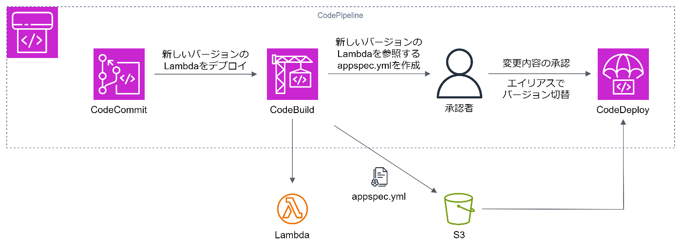 Lambdaへのデプロイの場合、CodeCommitへのソースコードプッシュを契機にCodeBuildが新しいLambda関数の作成とテスト、appspec.ymlの作成を実施します。その後、変更内容を承認してデプロイするという流れをCodePipelineがオーケストレーションするという流れになります。
