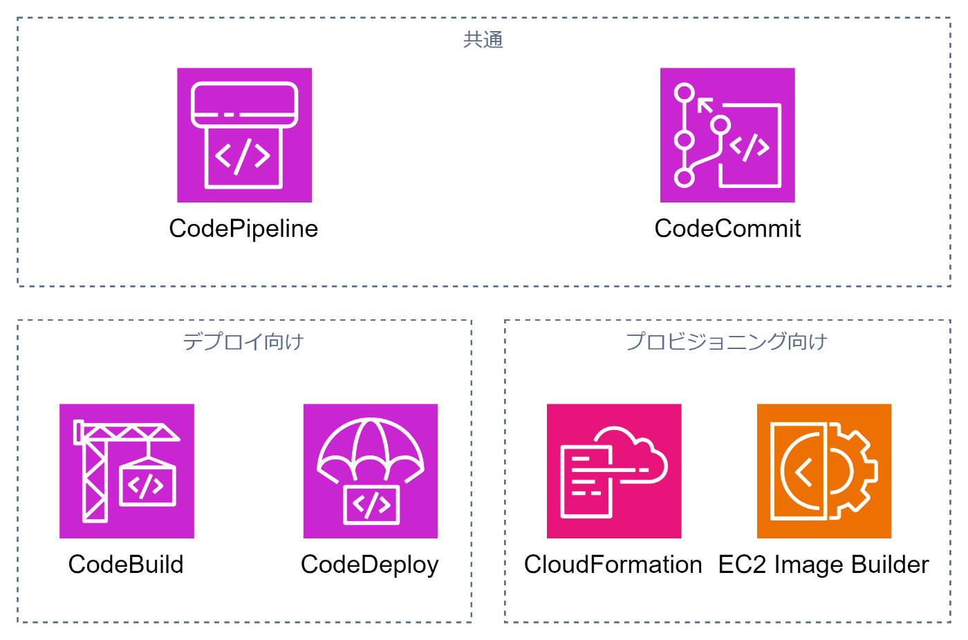 EC2をプロビジョニングする場合にはCodeCommit、CodePipeline、CloudFormatioinに加えてAMIを作成するためのEC2 Image Builderが必要になります。