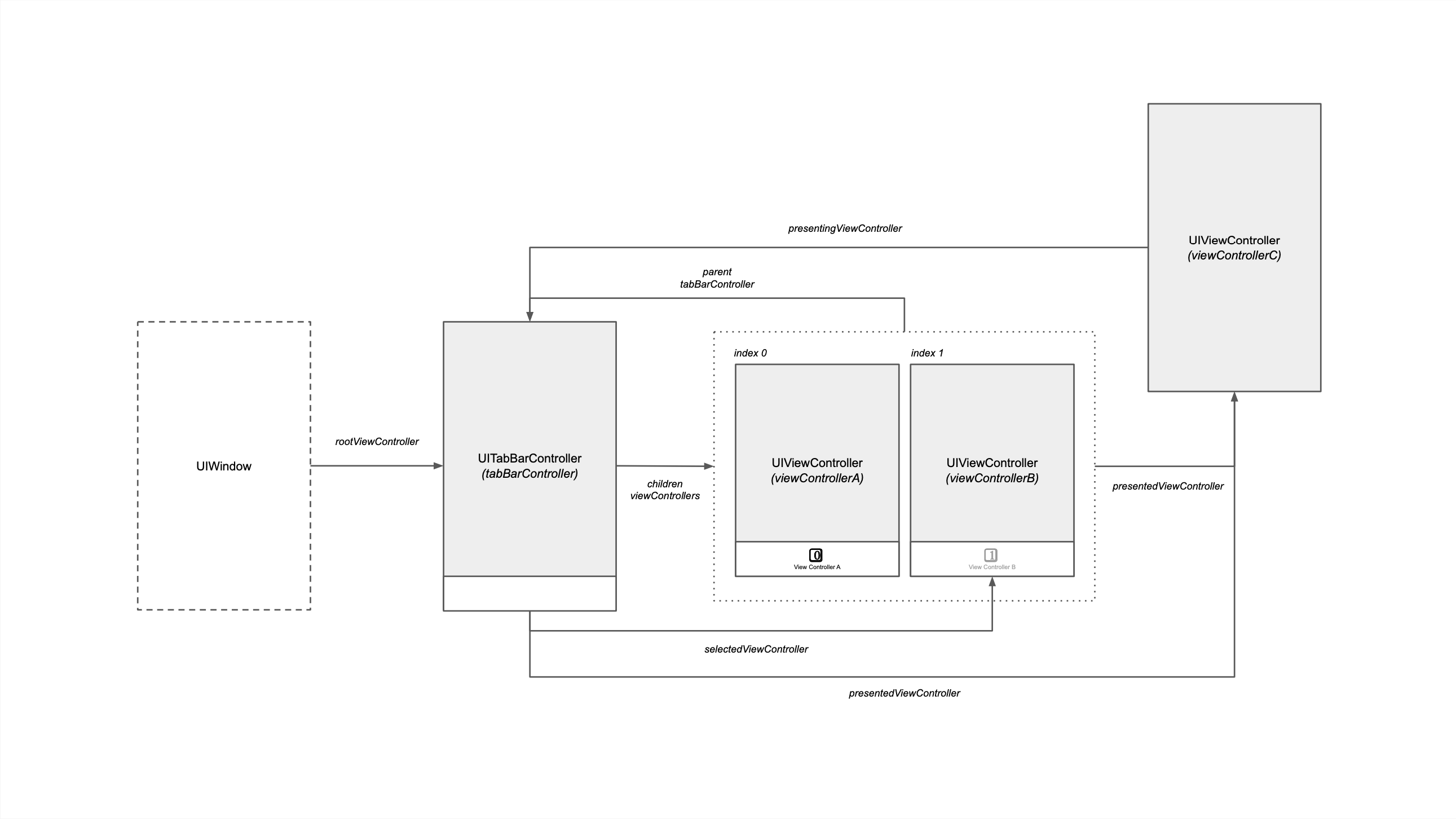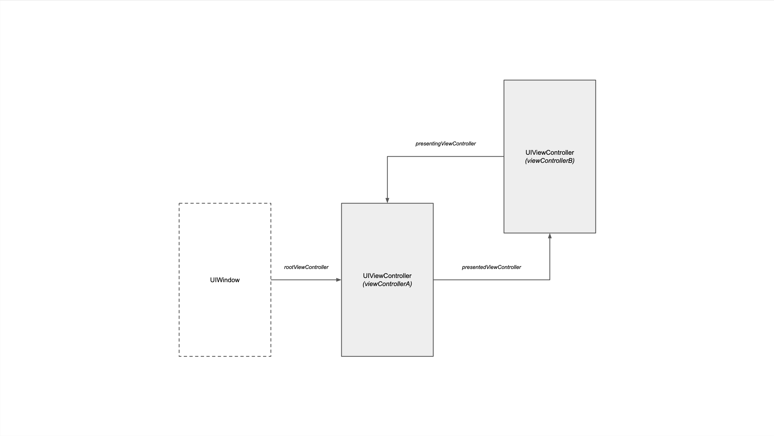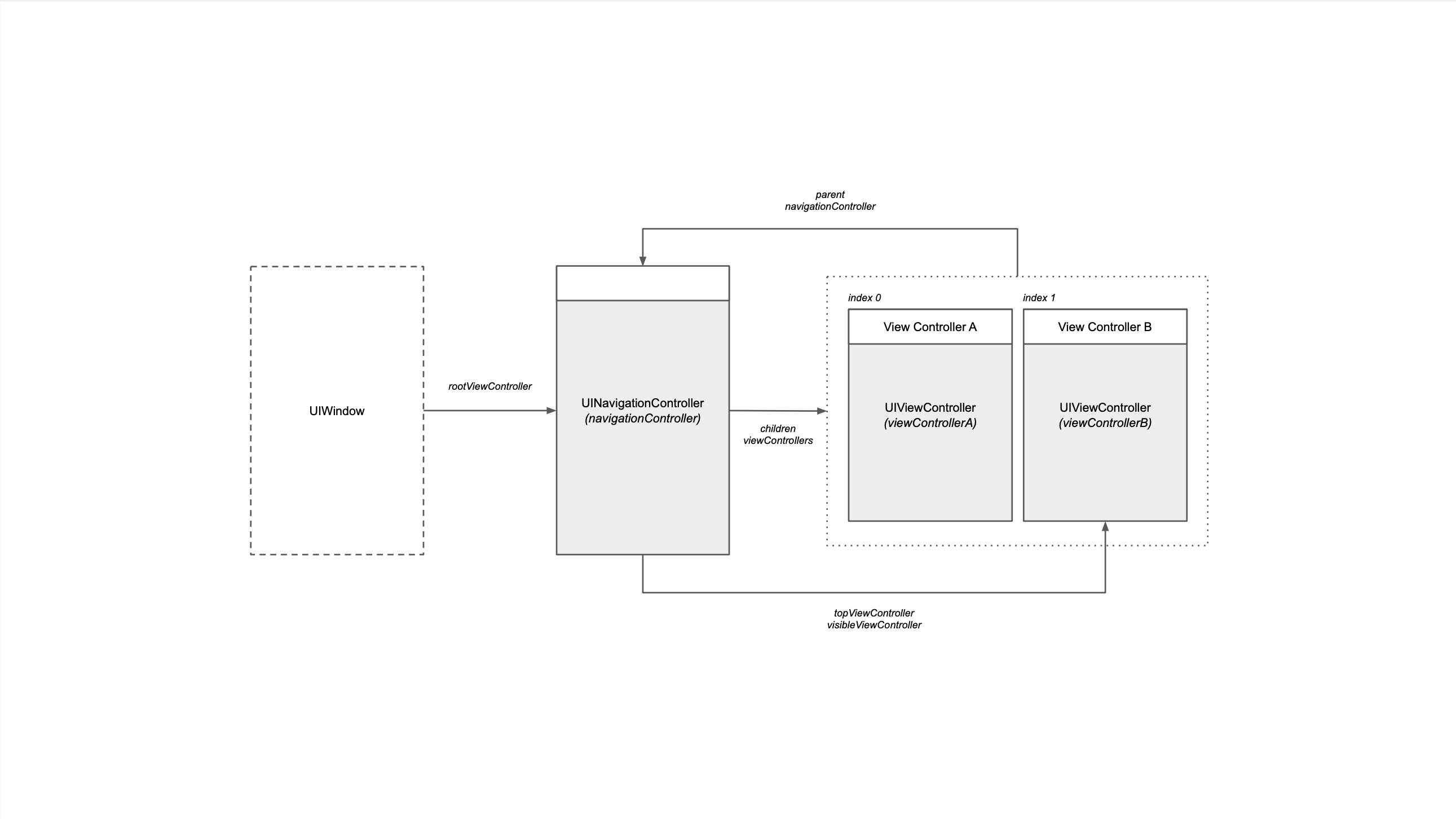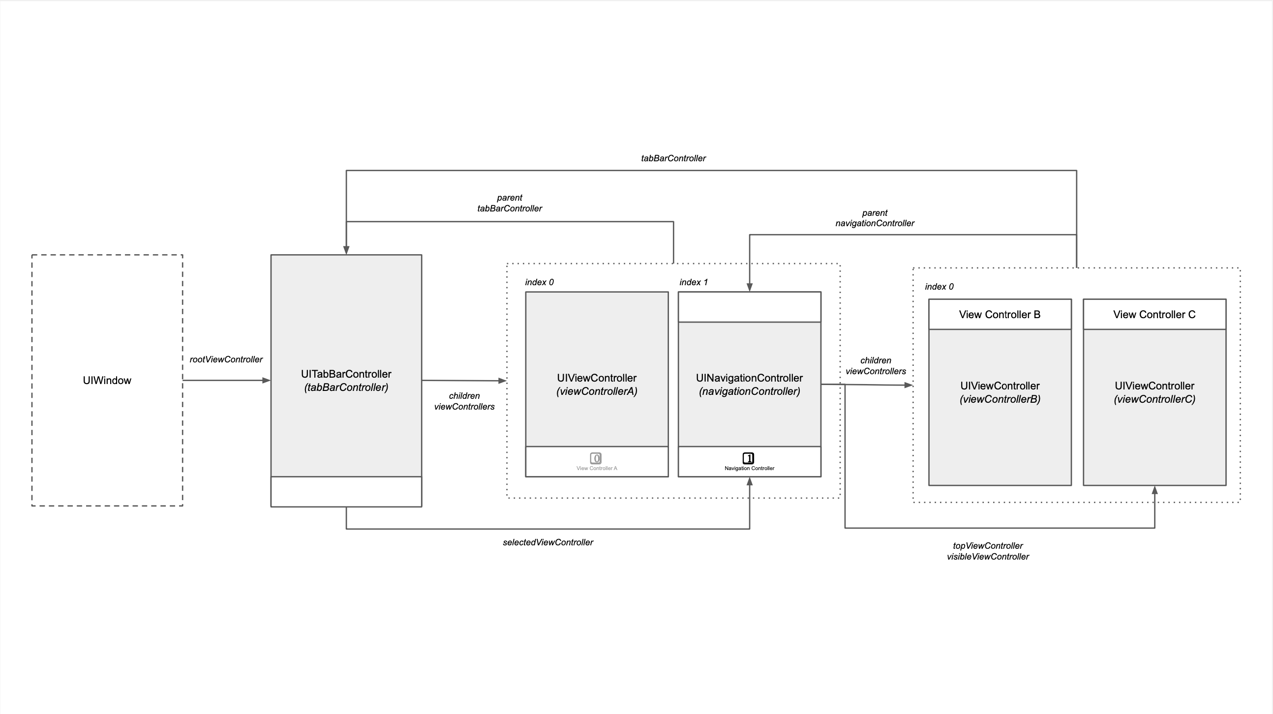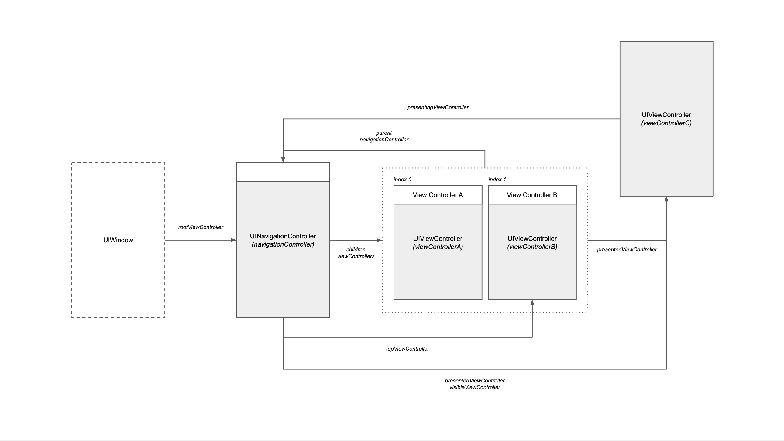 UIKit による iOSアプリの画面は1つ以上の UIViewController で構成され、画面遷移も UIViewController により行われます。また、UIViewController間の関連性は UIViewController のプロパティにより把握することができます。
