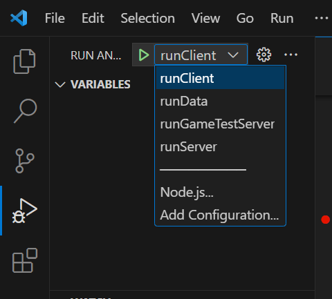 ④ [Run and Debug]を選択後、プルダウンリストが[runClient]であることを確認し、実行