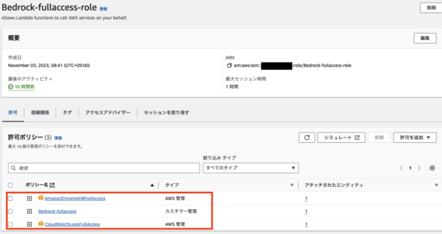 | IAMポリシー | Bedrock-fullaccess | カスタマー管理 | Bedrockを利用できるようにするためのポリシー |