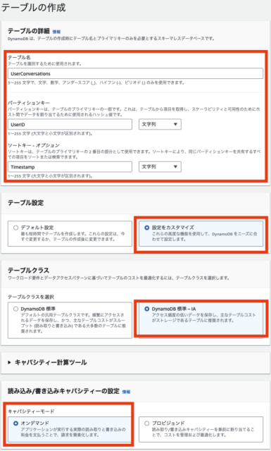 赤枠部分を入力し、設定画面右下「テーブルの作成」を押下