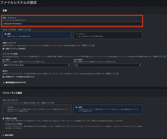 EFS > 『ファイルシステムの作成』 > 『カスタマイズ』を押下