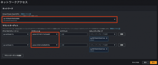 ・対象とするVPC及び サブネットを選択、SGはデフォルトを利用して次へを押下し、EFS作成