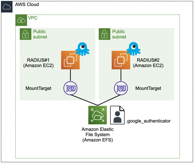 Google Authenticator 連携した多要素認証のRADIUSサーバ(EC2)構築ハンズオンを踏まえ、MFAを発行する際に作成されるユーザを情報を、それぞれのRADIUSサーバに保存するのではなく、EFSを利用して1カ所に保存するようにしていきます。