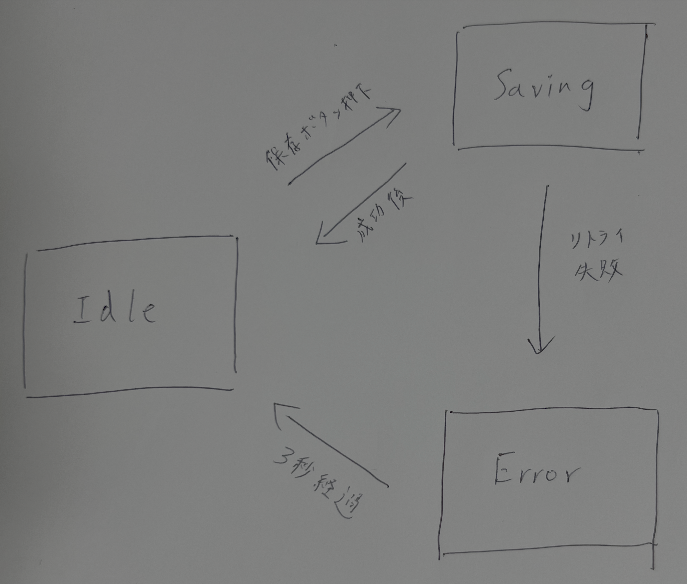 列挙した項目を見ながら、要件と変化するものの対応表を作成します要件 変化するもの ①保存処理開始 スピナーが出る ②二重押下禁止 ボタンが押せなくなる ③成功時 トーストを出す ④リトライ (内部的な挙動なのでUIは変わらず) ⑤リトライも失敗 → ダイアログ表示 ダイアログが出る ⑥3秒後 ダイアログが消える