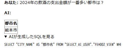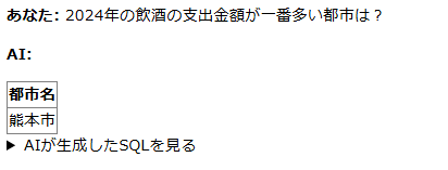 ①ブラウザを通じて質問を投げます(例:2024年の飲酒の支出金額が一番多い都市は?)