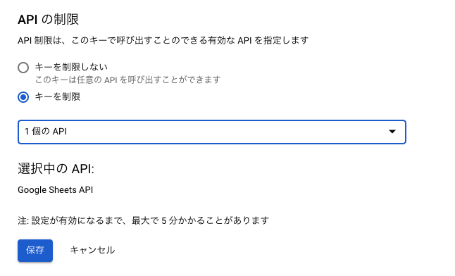 APIの制限では、今回スプレッドシートからのデータ取得のみなので「Google Sheets API」を選択します。