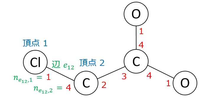 水素を除いた化合物グラフ $G = (V, E)$ の各辺 $e_{ij} \in E$ について、以下の数を定義する。$n_{e_{ij}, i} = (頂点iとの距離が、頂点jとの距離より近いような頂点の個数)$