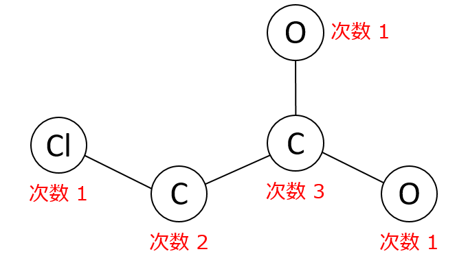 例: モノクロロ酢酸の場合は以下のようなグラフとなる(多重結合でも辺は1本と考える)ため、 $ABC(G) = \sqrt{\frac{1+2-2}{1\times2}} + \sqrt{\frac{2+3-2}{2\times3}} + \sqrt{\frac{1+3-2}{1\times3}} \times 2= 3.047$ となる。