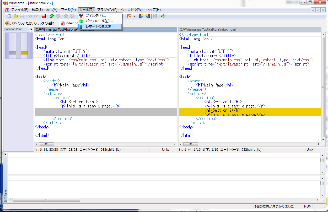 「ツール(T)」>「レポートの生成(R)」を選択することで、ブラウザで確認可能な資料としてdiffを出力することが可能です。