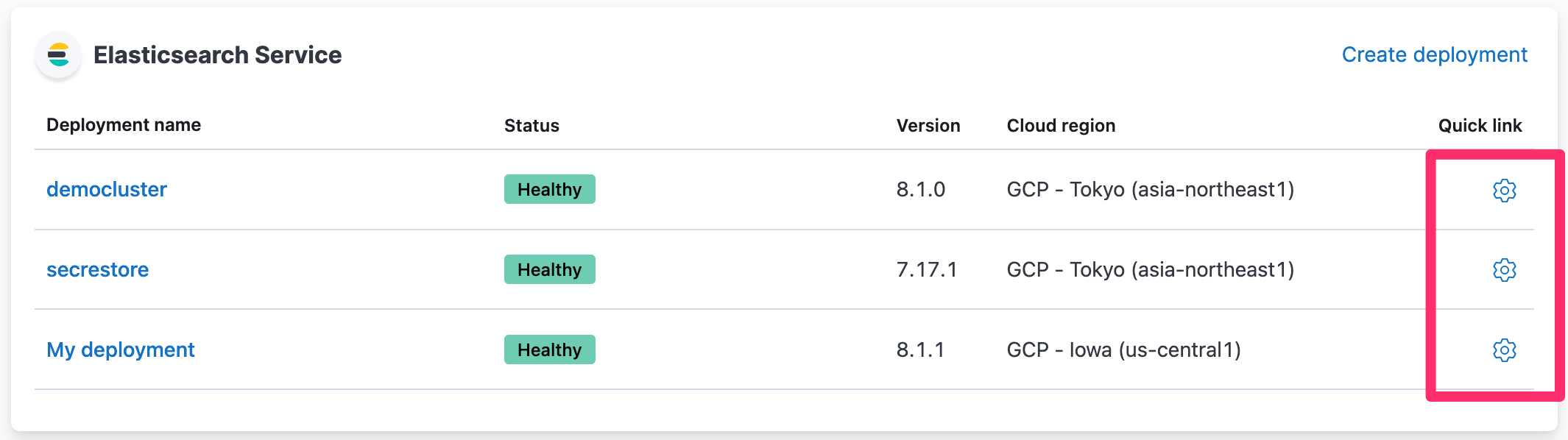 クラスターのその他のエンドポイントを知りたい場合、デプロイメントを編集したい場合等は一覧の右側にある歯車を押すと、デプロイメントの詳細設定画面に飛べます。