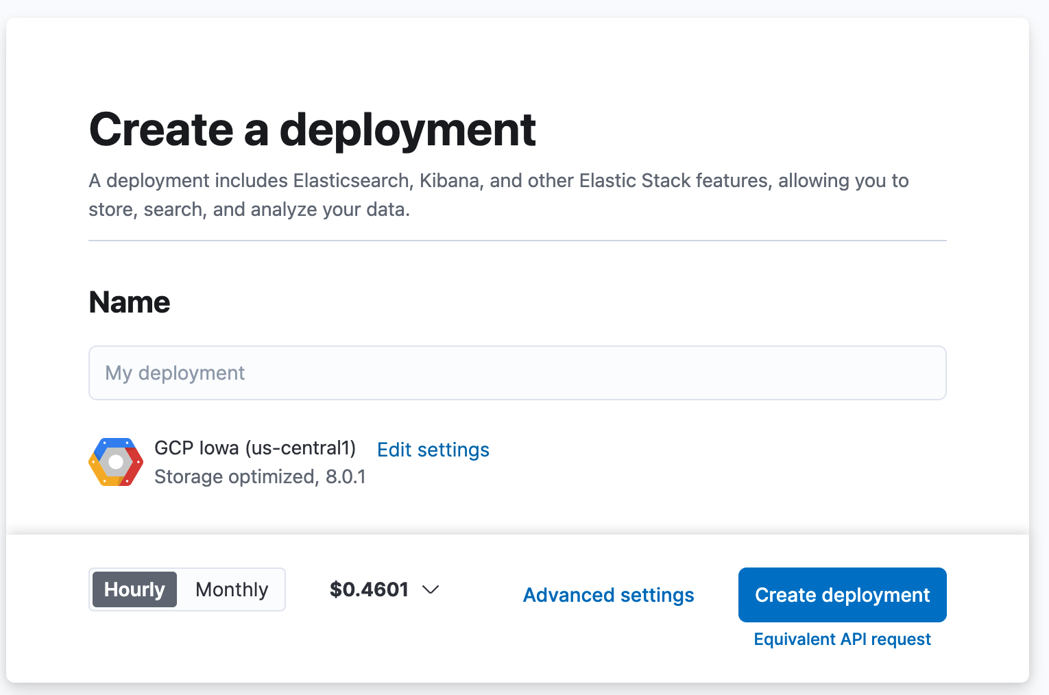 何も変えずに、Create deployment を押すと、デフォルトのサイズの、"My Deployment" という名のクラスターが、GCP Iowa で作成されてしまいますのでご注意ください。