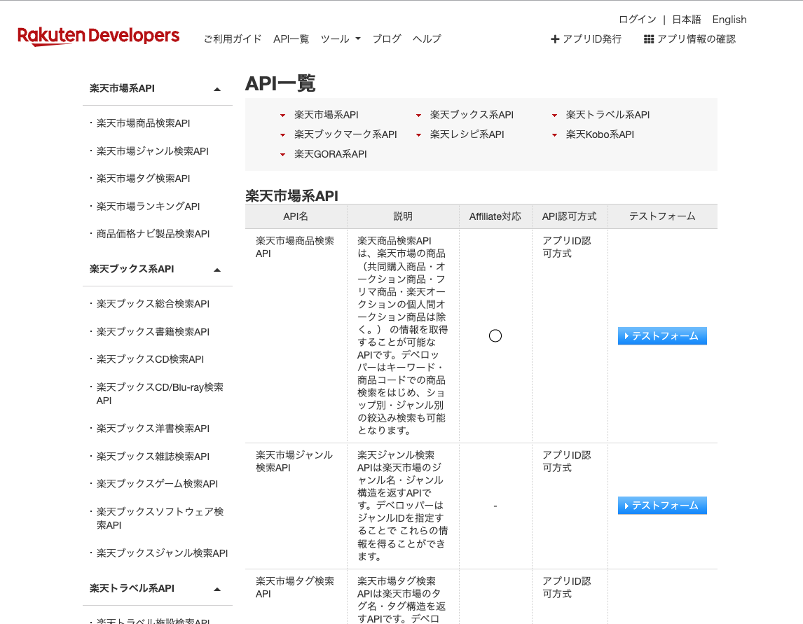 楽天Apiは、使用の申請が簡単で、ドキュメントも親切なので、最初に扱うものとしてオススメです。