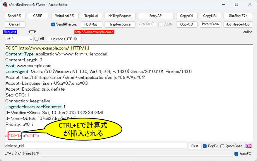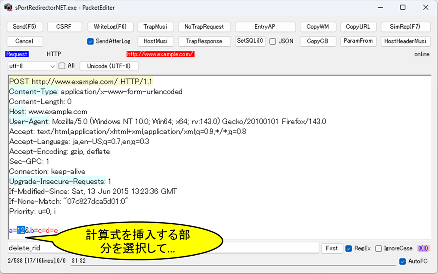 あとは、HTTPリクエストメッセージの編集画面で、、、、