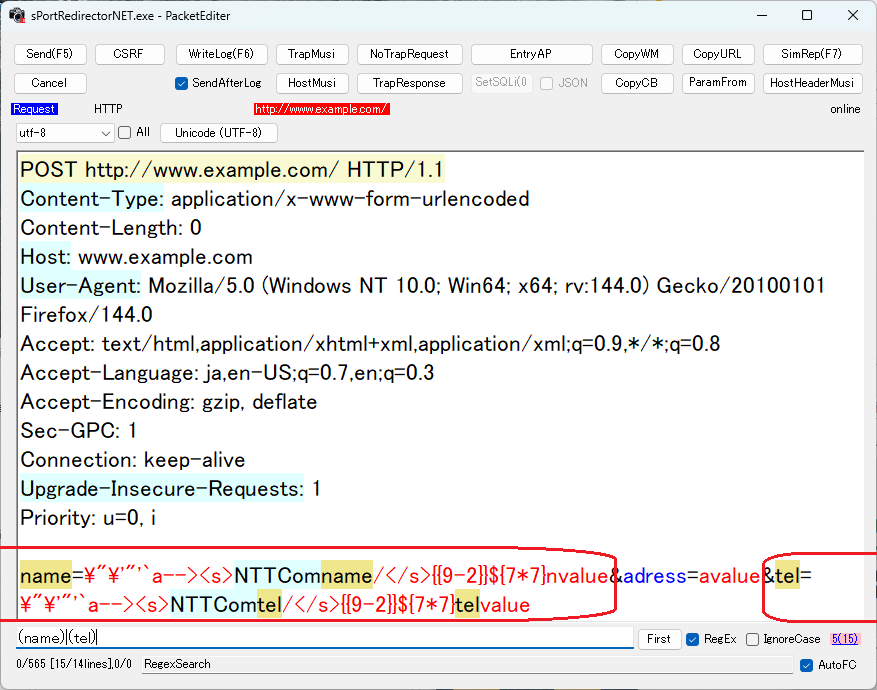 今回の例示では、たくさんあるパラメータの中で(といっても3つだけだけど・・・)、「name」と「tel」という2つのパラメータにXSS脆弱性があるとする。