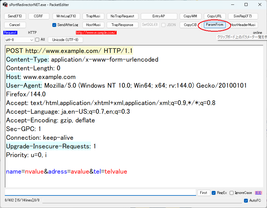 「ParamForm」ボタンを押すだけで、特定したパラメータだけに脆弱性試験用文字列が挿入される