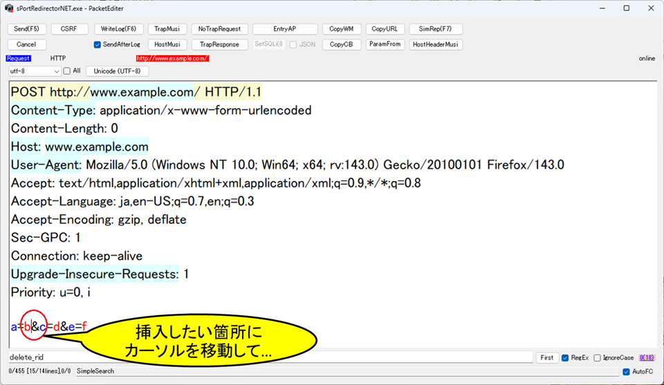 あとは、HTTPリクエストメッセージの編集画面で、、、、