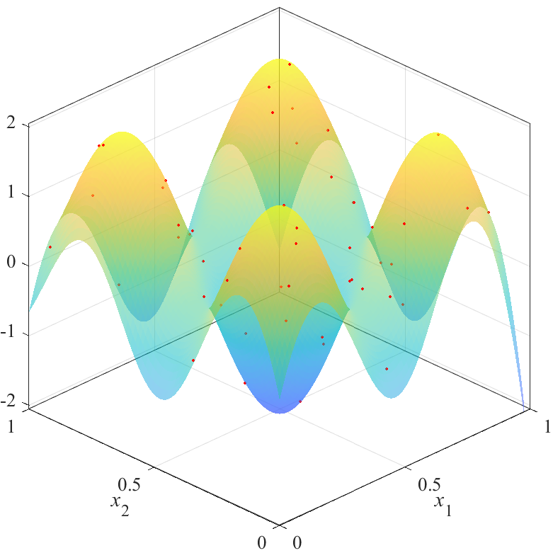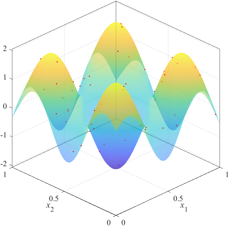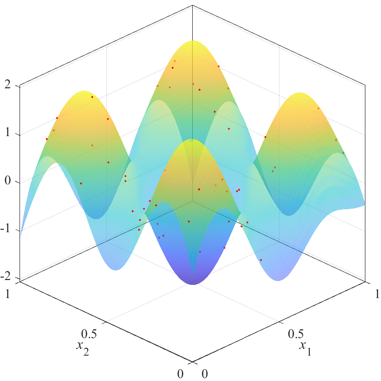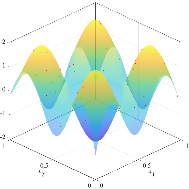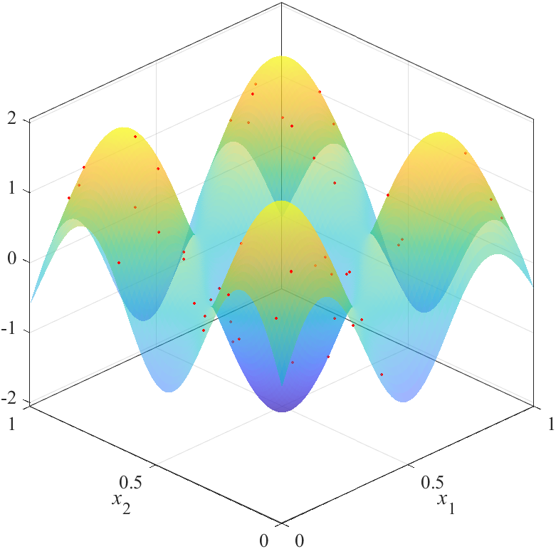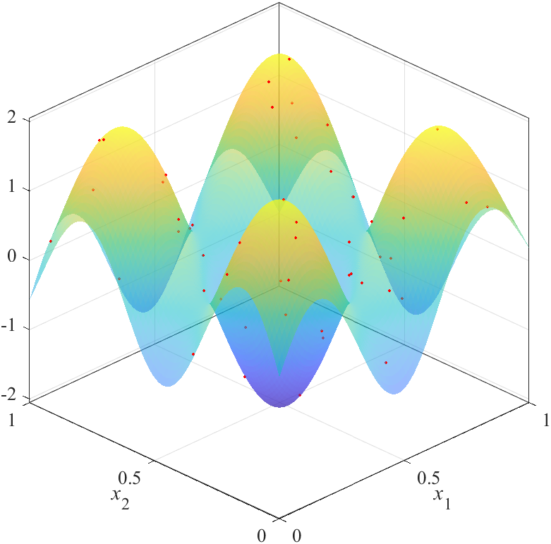 図の赤点が点群X,青から黄色の面が推定した応答曲面を表します.