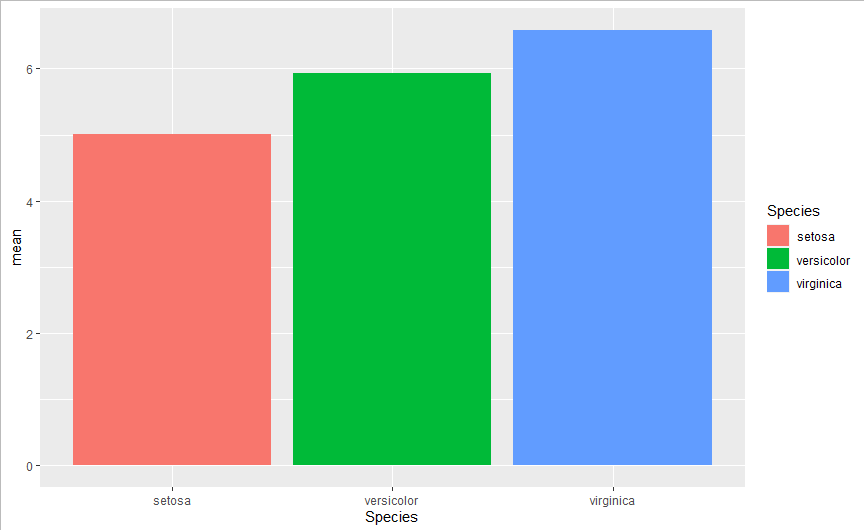 aes(y=mean,x=Species,fill=Species) #グラフのx,yの指定,fillは色の塗り分け.今回はSpeciesで塗り分けたい