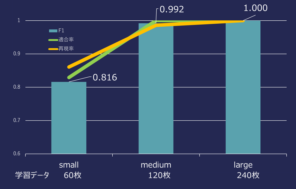 モデルの規模を追うよりも、まずは1種類あたり10〜20枚程度の良質なデータを揃えることで、適合率・再現率ともに98%超という実用的なラインに到達できます。 -