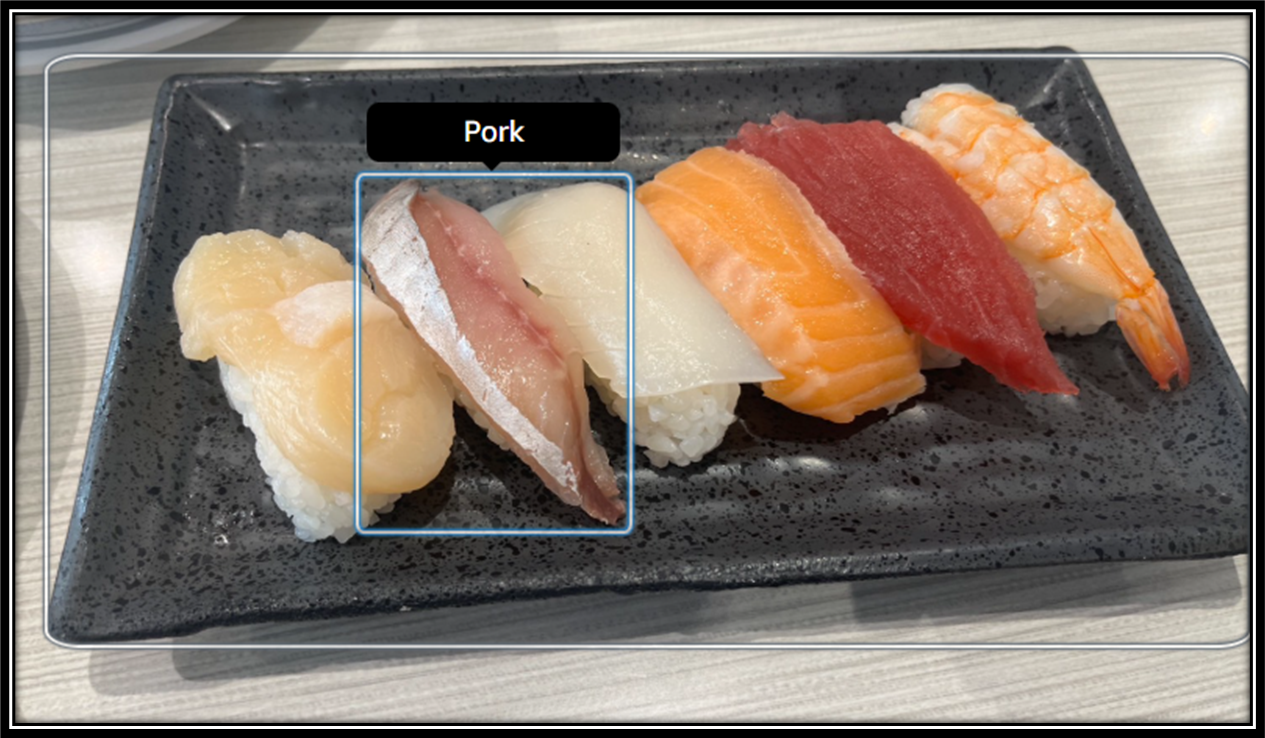 - 誤認識の発生: 寿司が「Pork(豚肉)」と判定される。